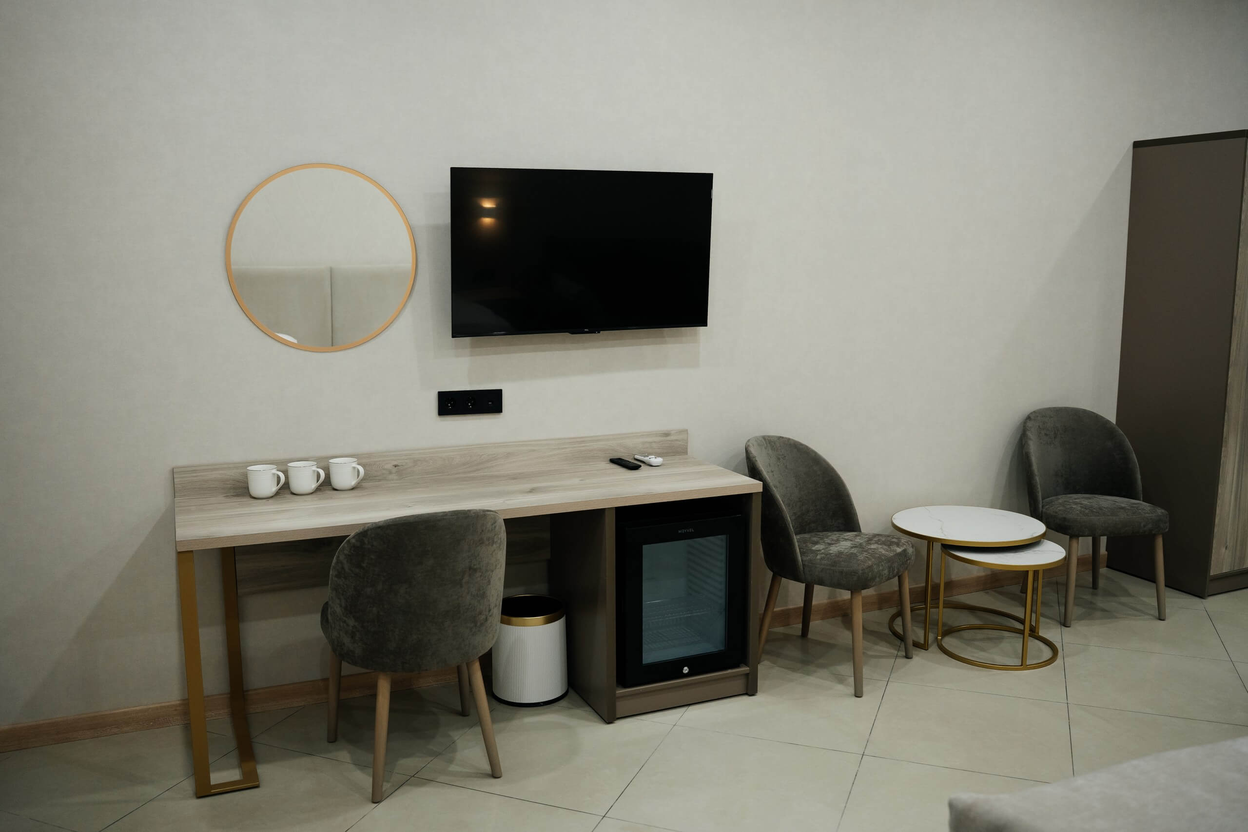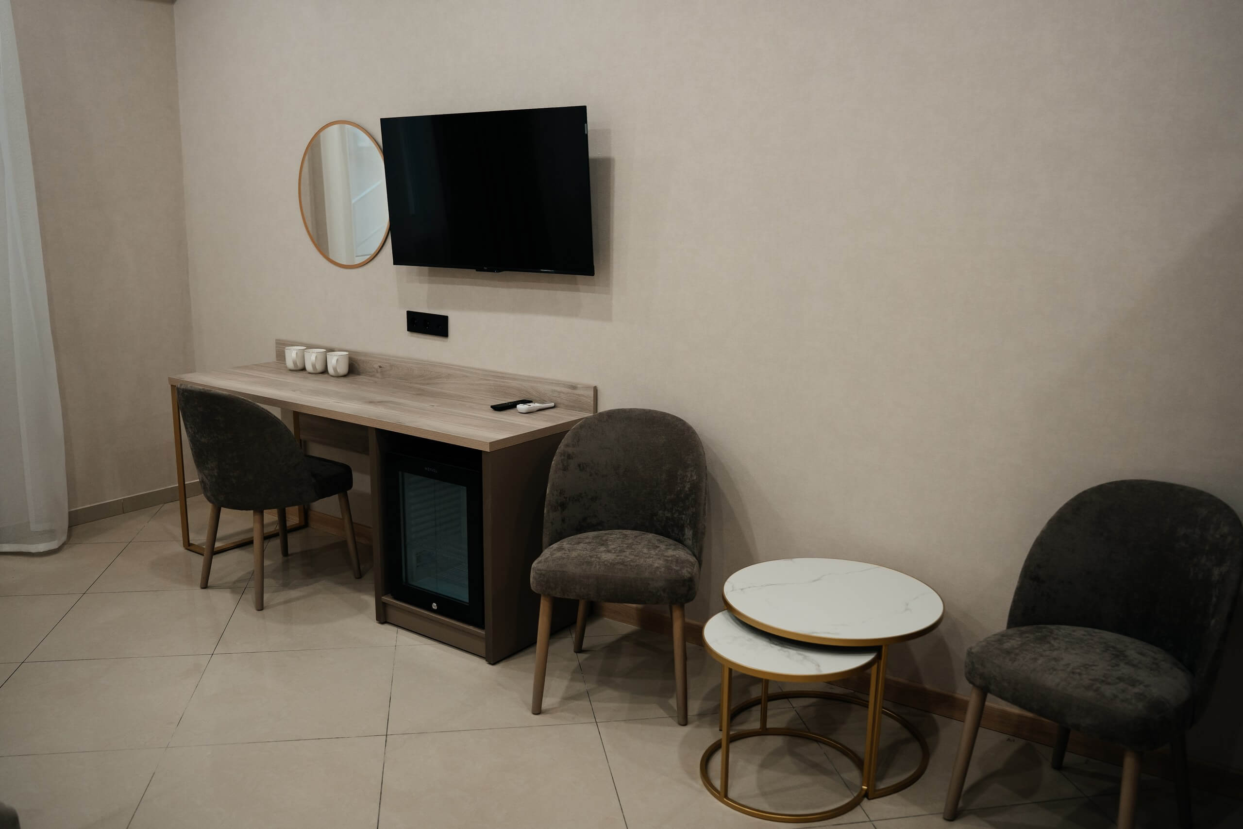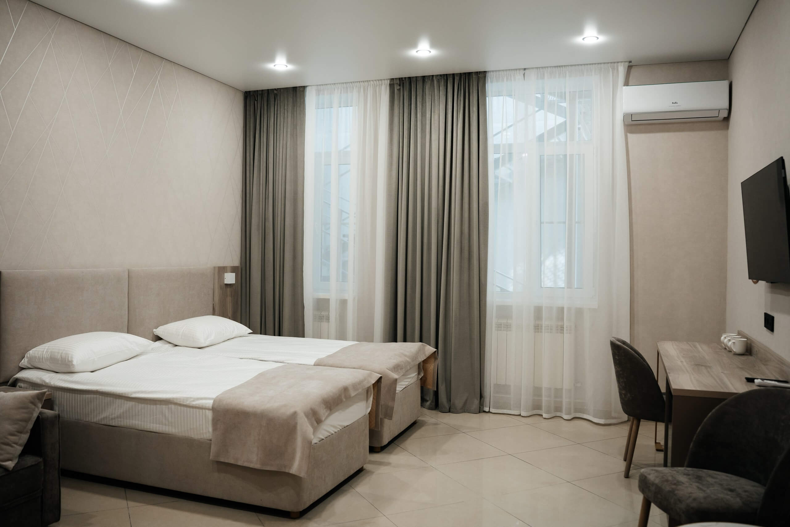 две раздельные кровати с возможностью объединить, тумбочки со светильниками, диван, телевизор, кондиционер, мини-бар, туалетный столик