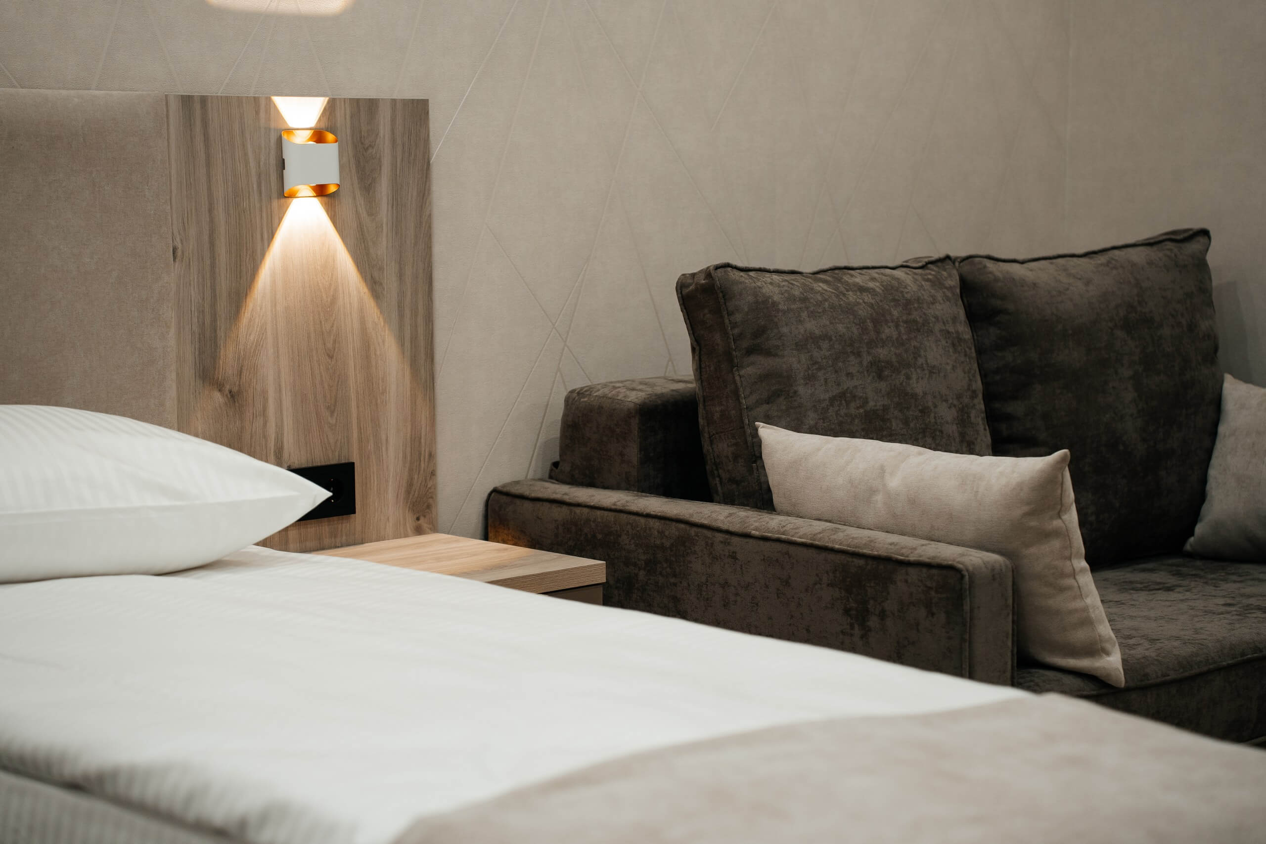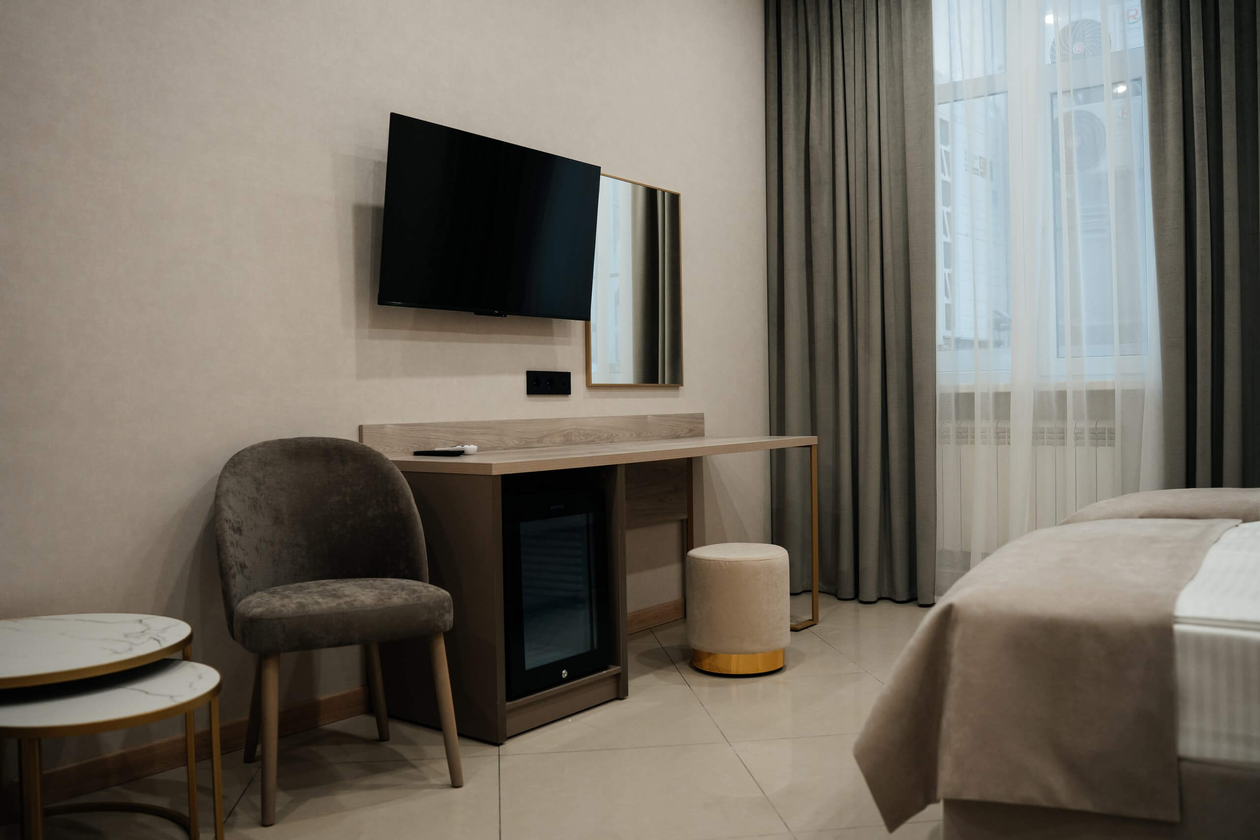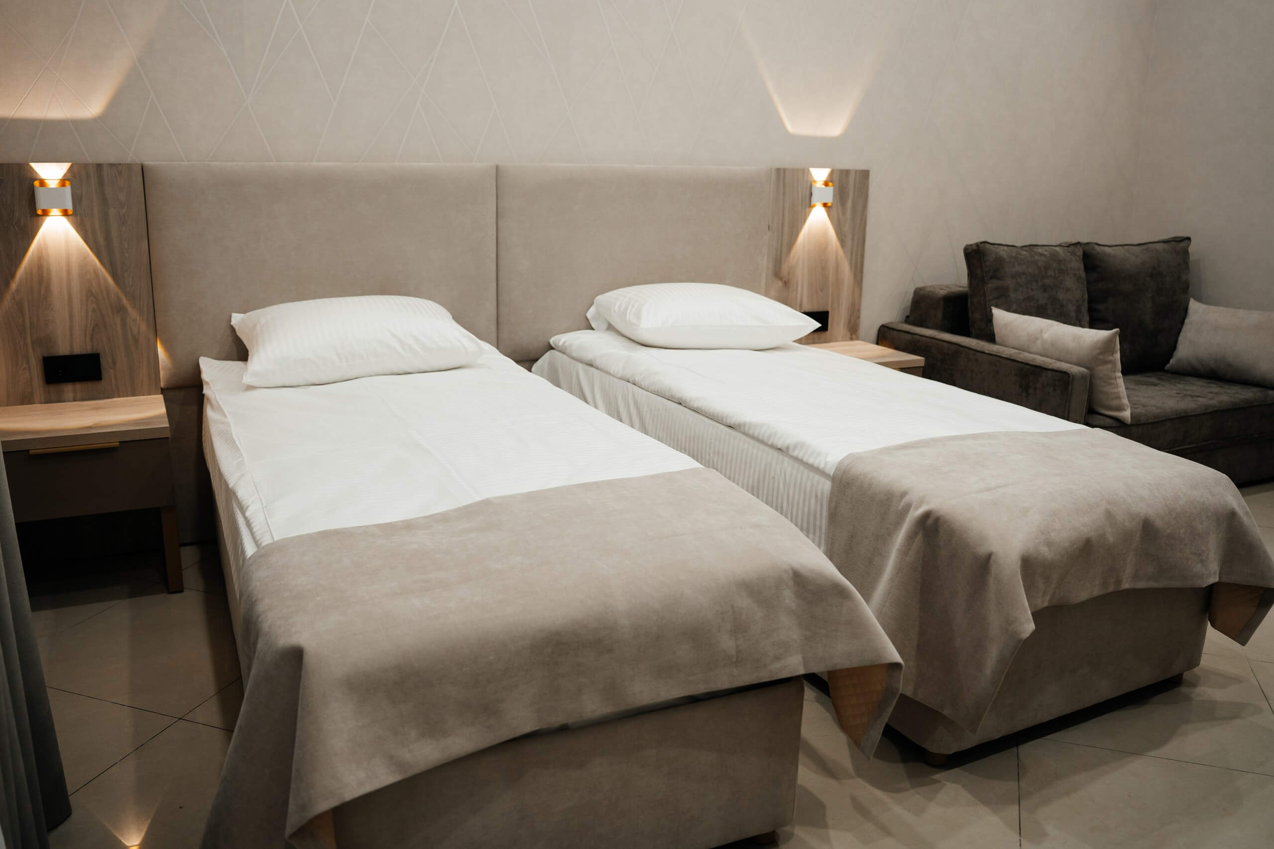две раздельные кровати с возможностью объединить, тумбочки со светильниками, диван, телевизор, кондиционер, мини-бар, туалетный столик