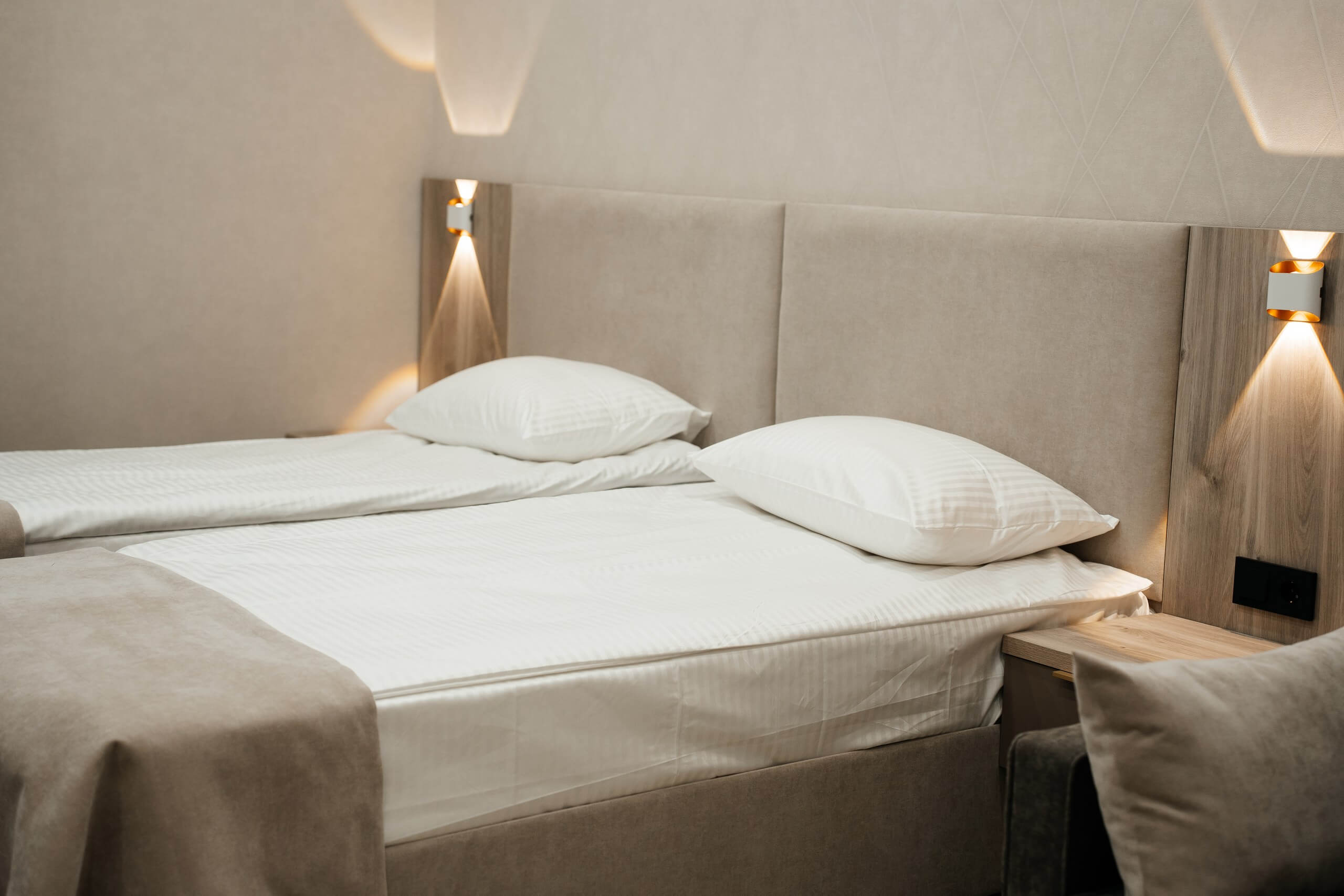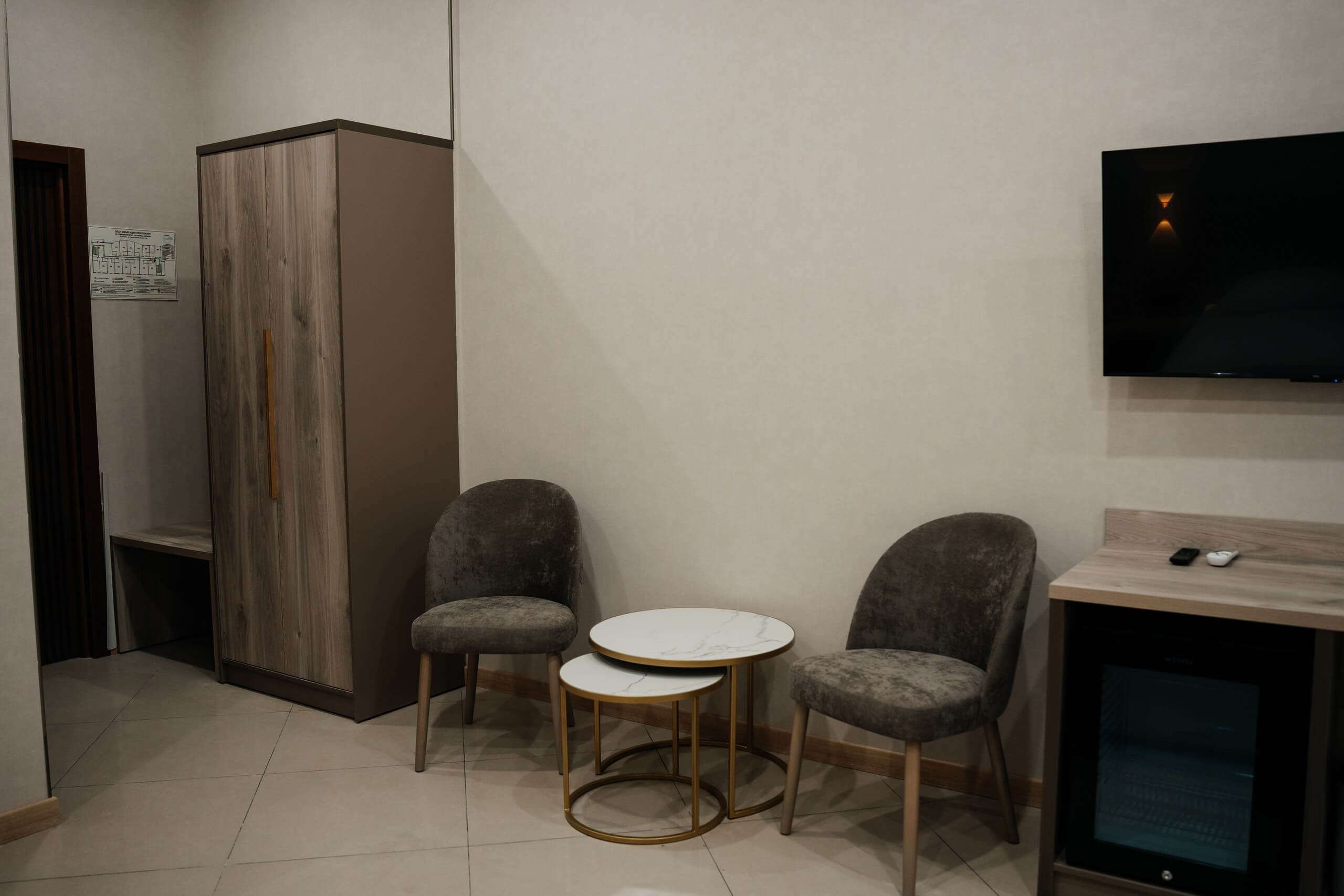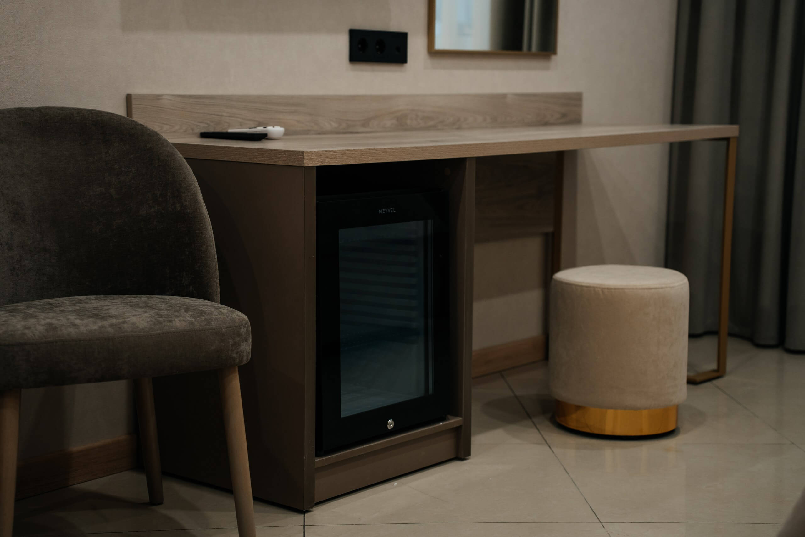 две раздельные кровати с возможностью объединить, тумбочки со светильниками, диван, телевизор, кондиционер, мини-бар, туалетный столик