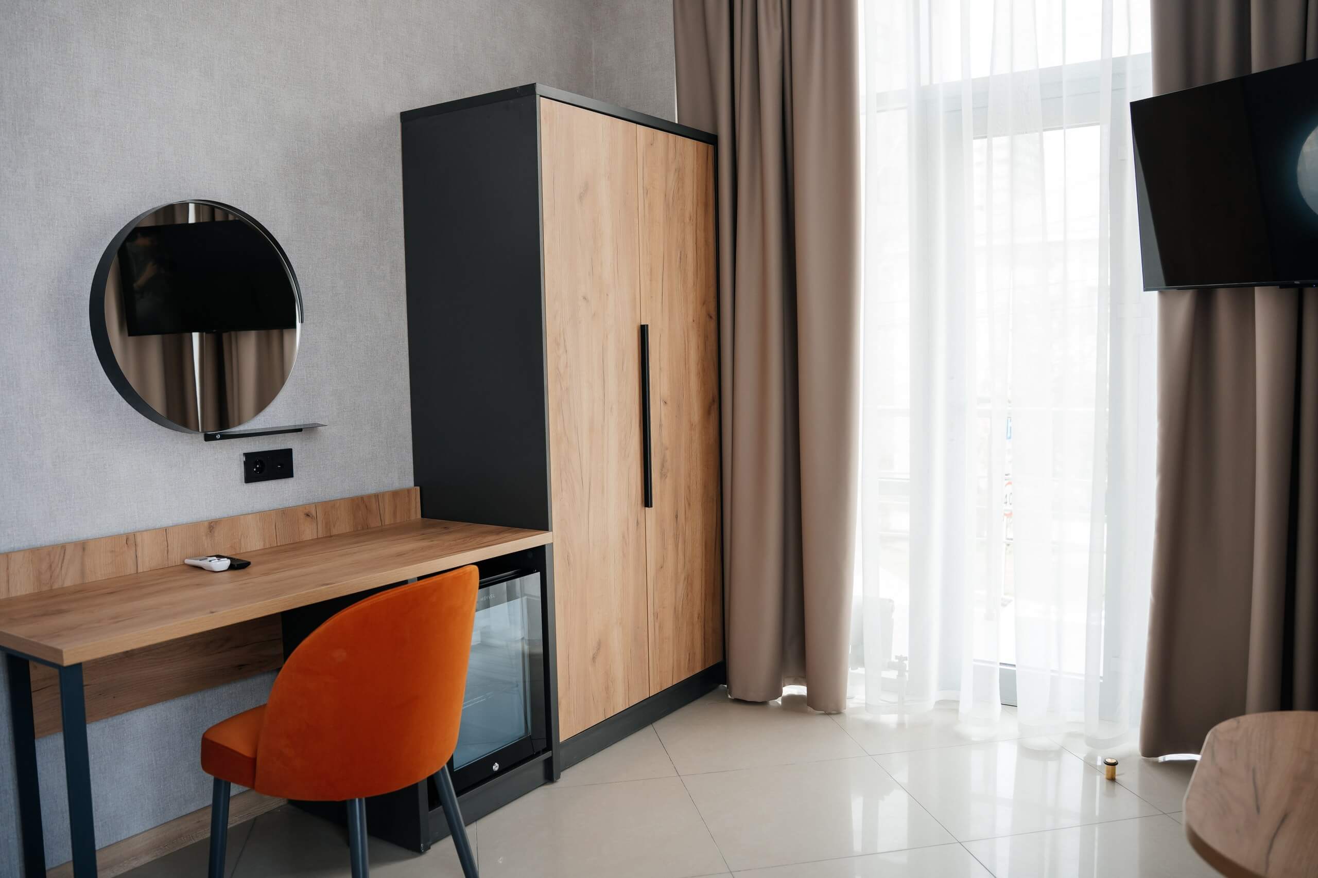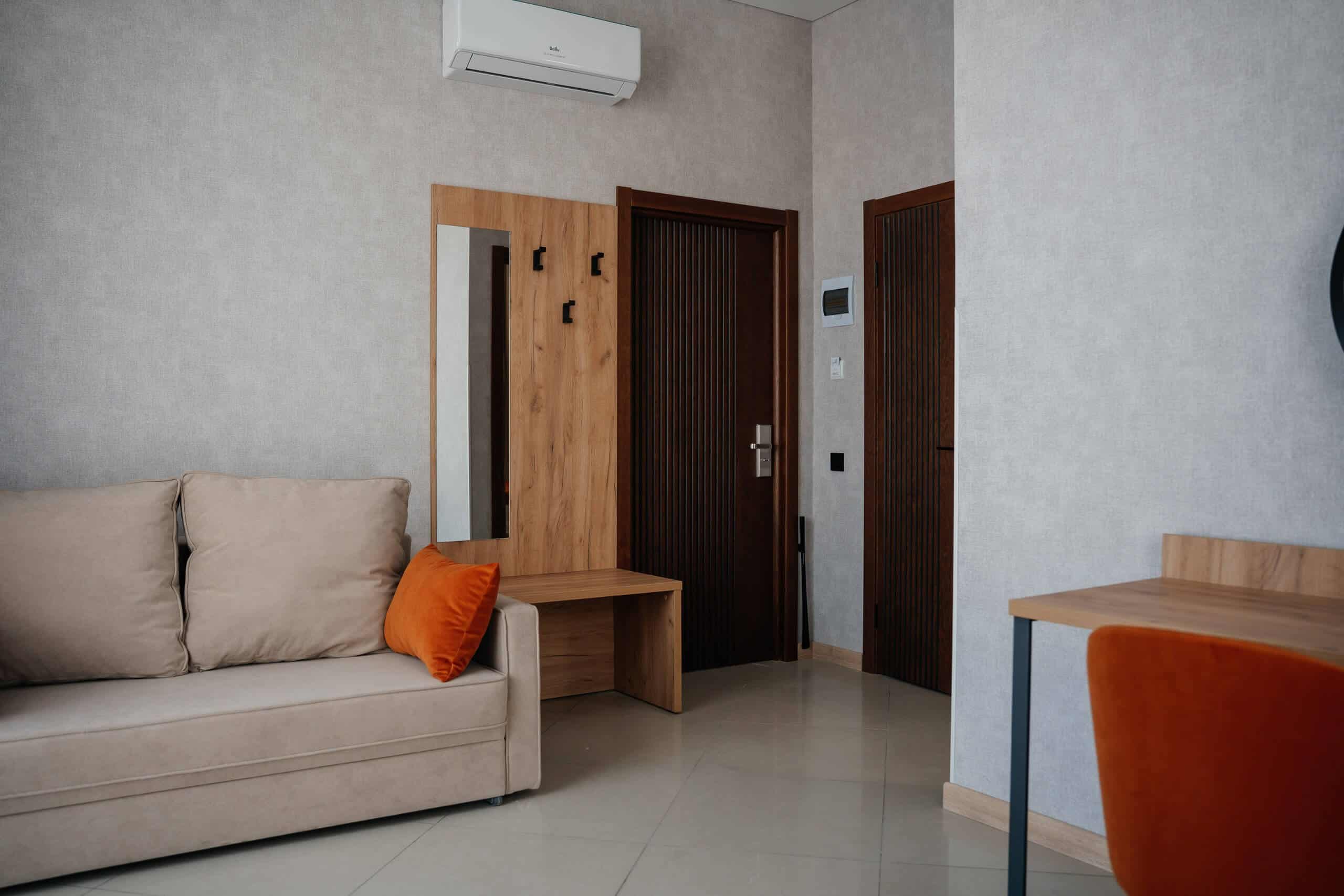 Диван, туалетный столик, телефон, мини-бар, телевизор, кондиционер, журнальный стол, выход на балкон