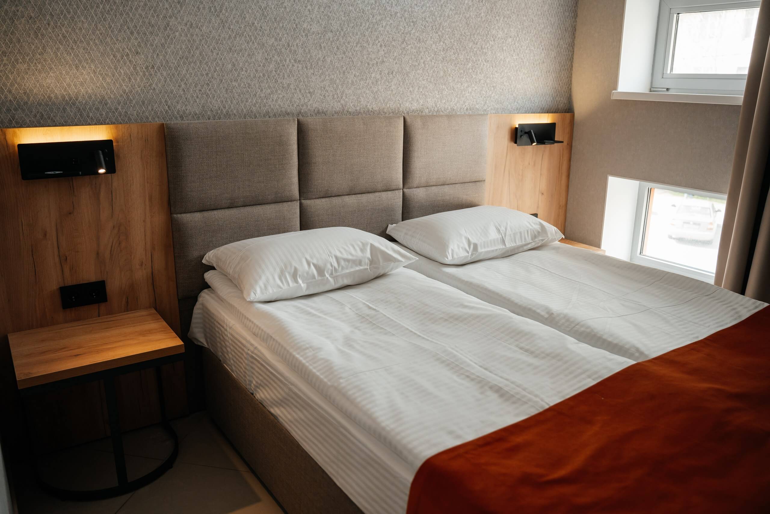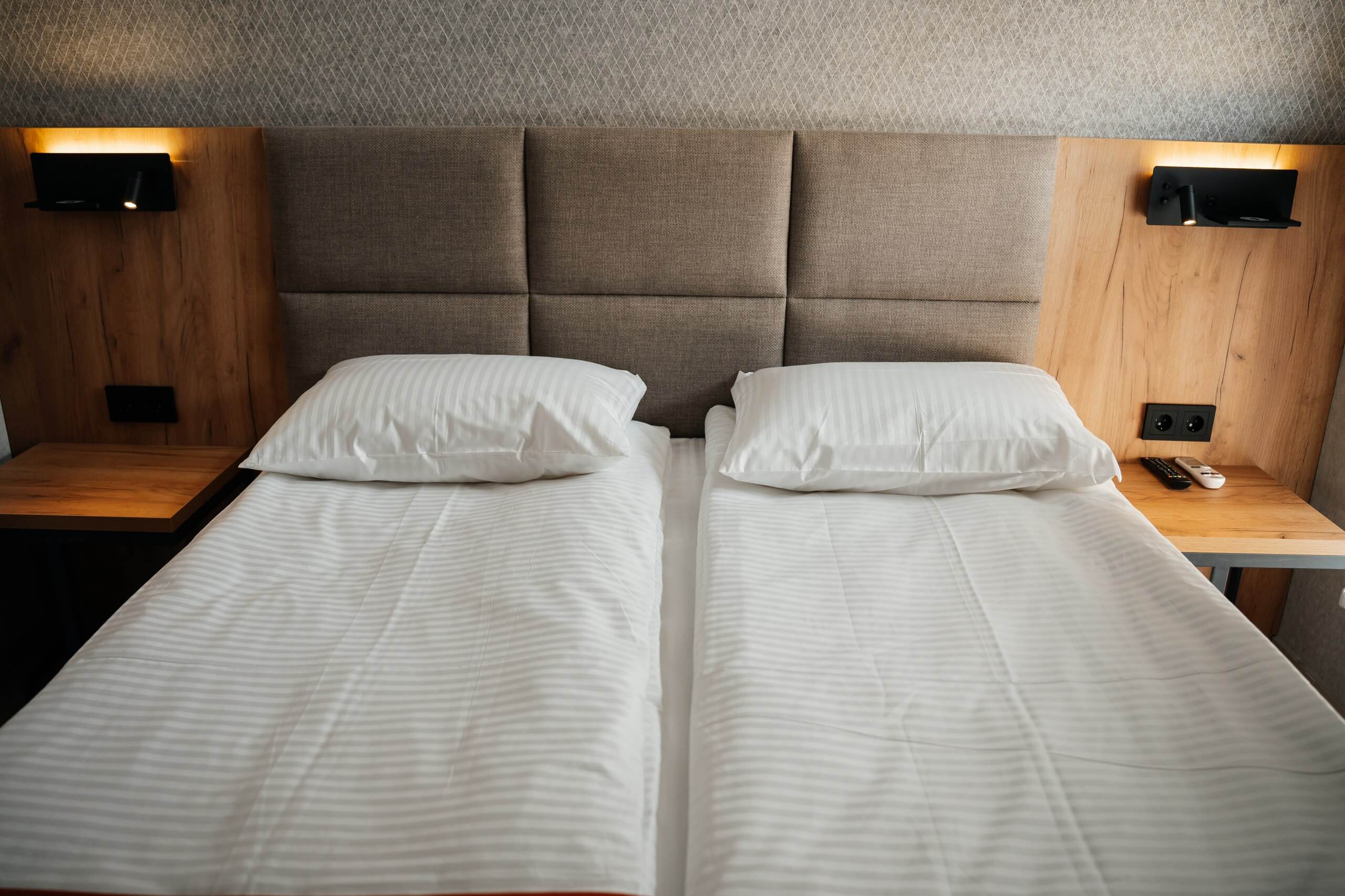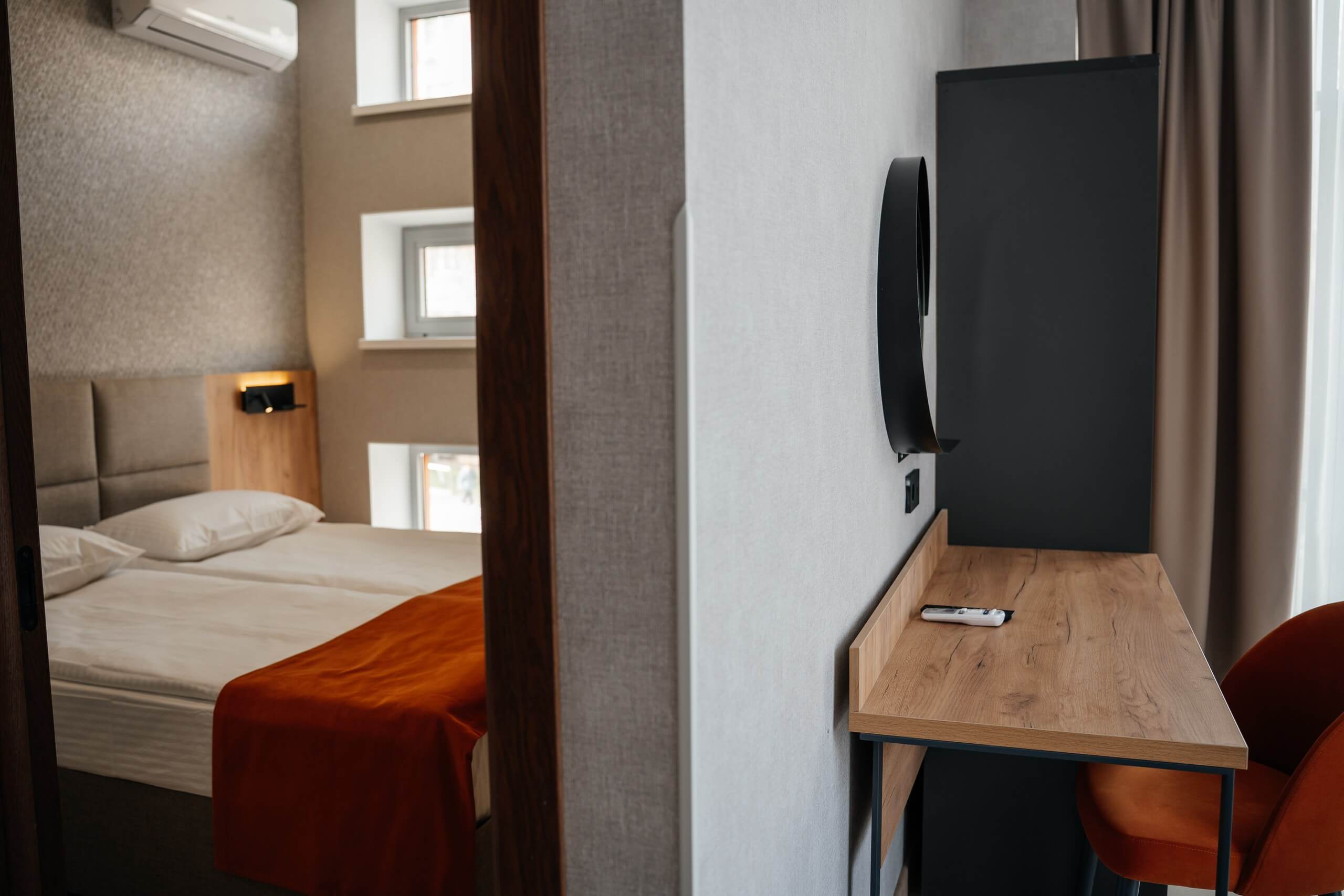 двуспальная кровать, тумбочки со светильниками, телевизор, кондиционер