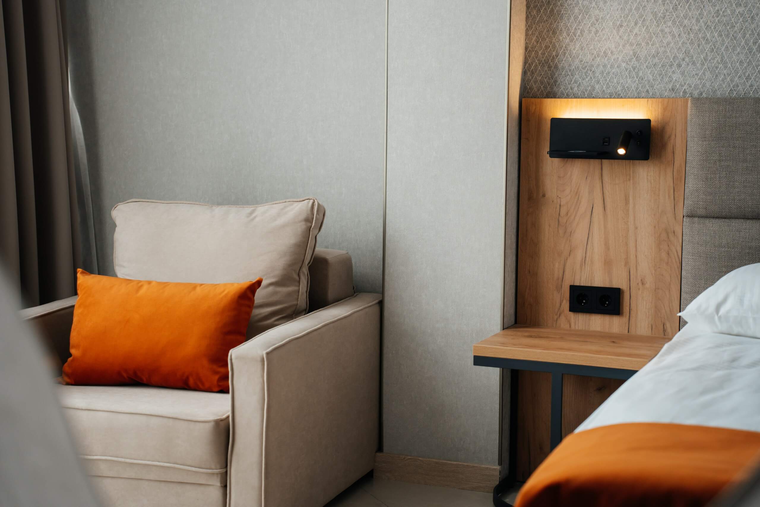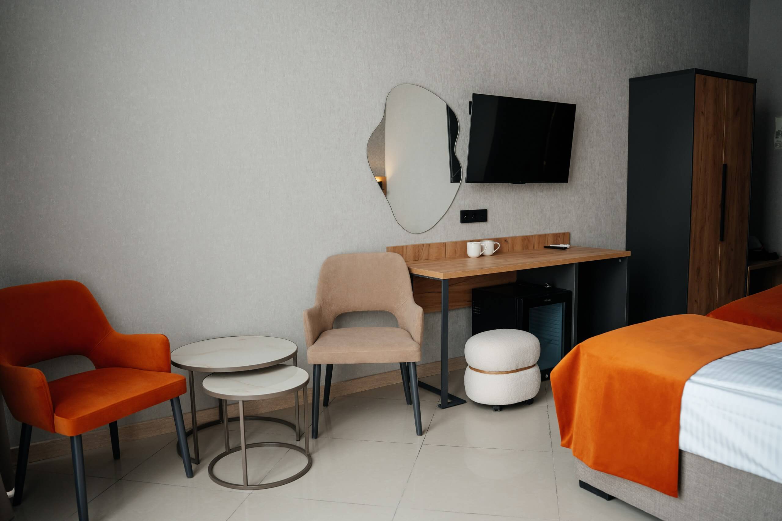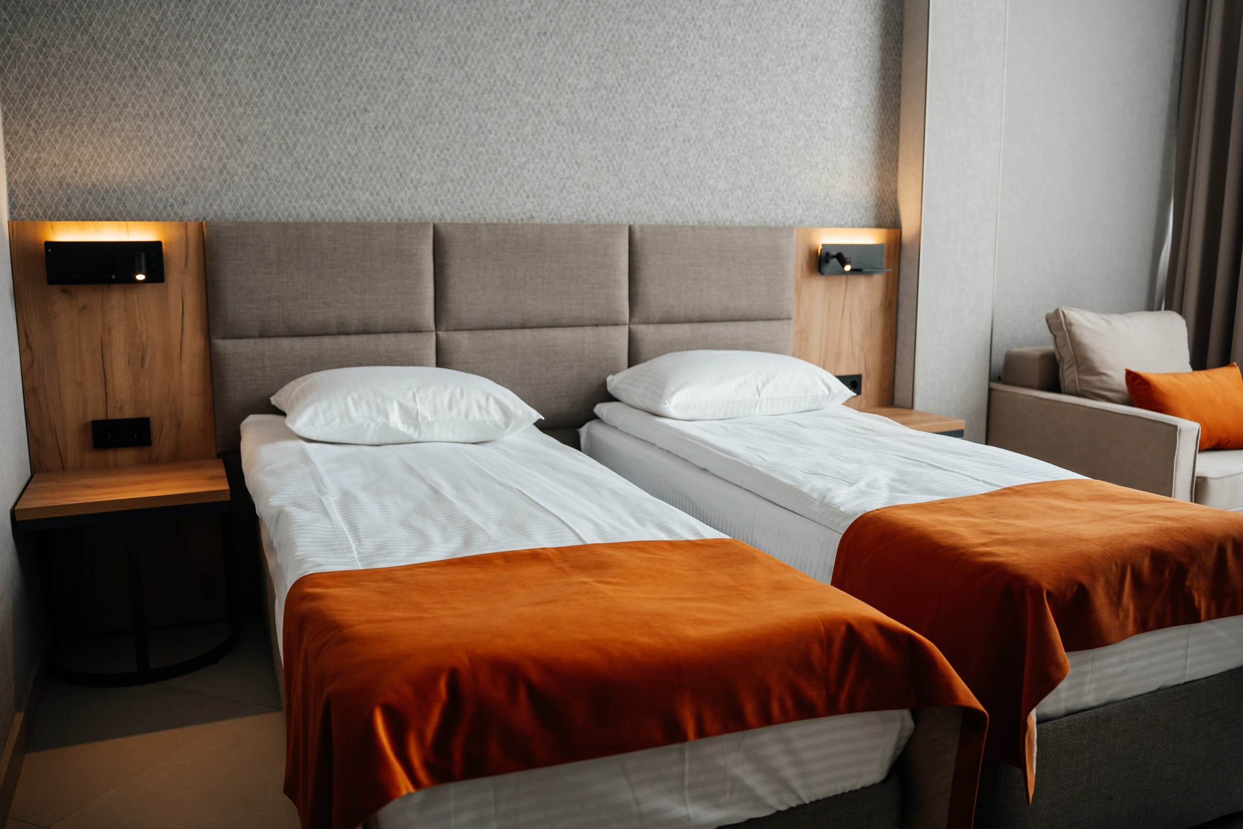 Две раздельные кровати с возможностью объединить, тумбочки со светильниками, кресло-кровать, телевизор, кондиционер, мини-бар, туалетный столик