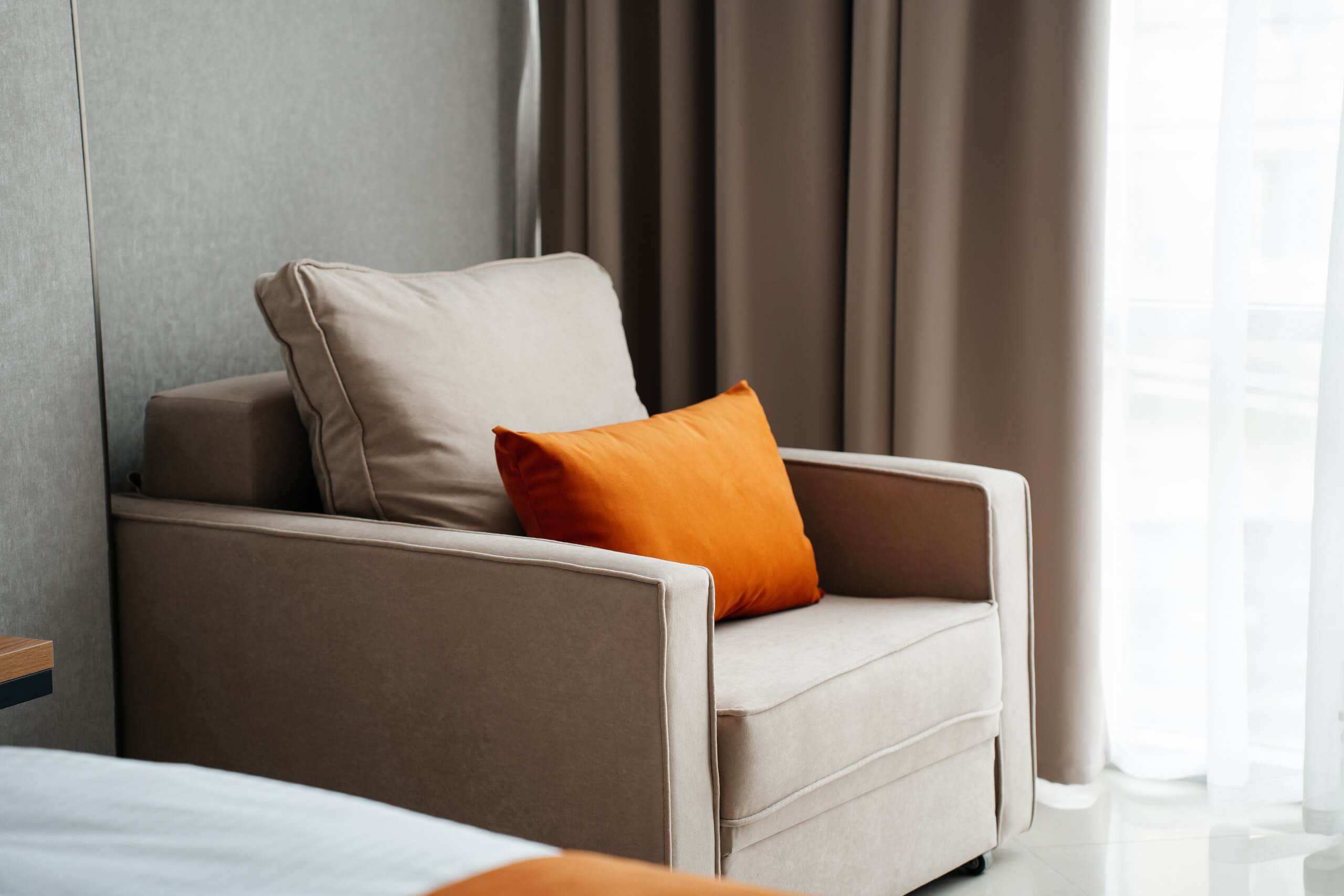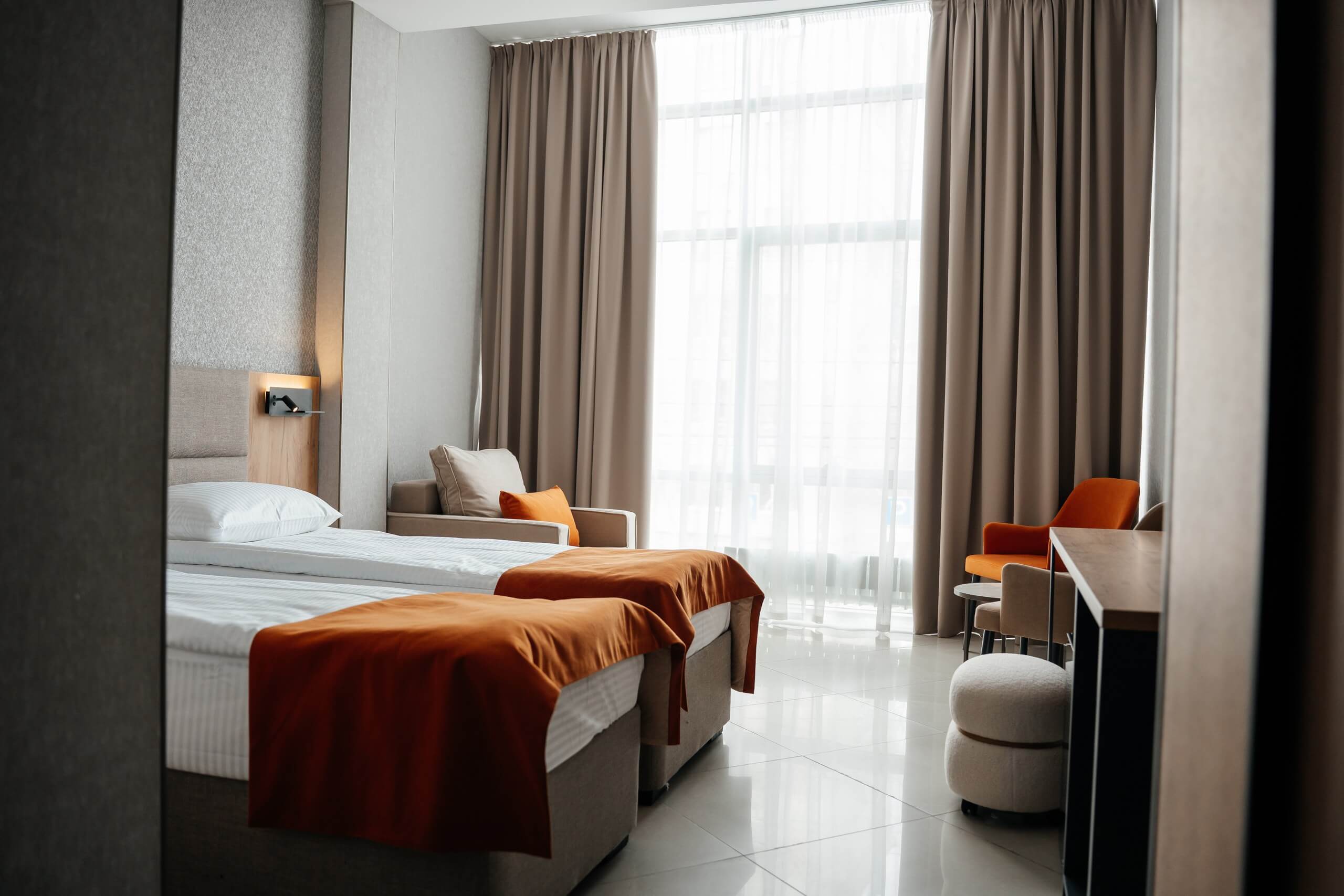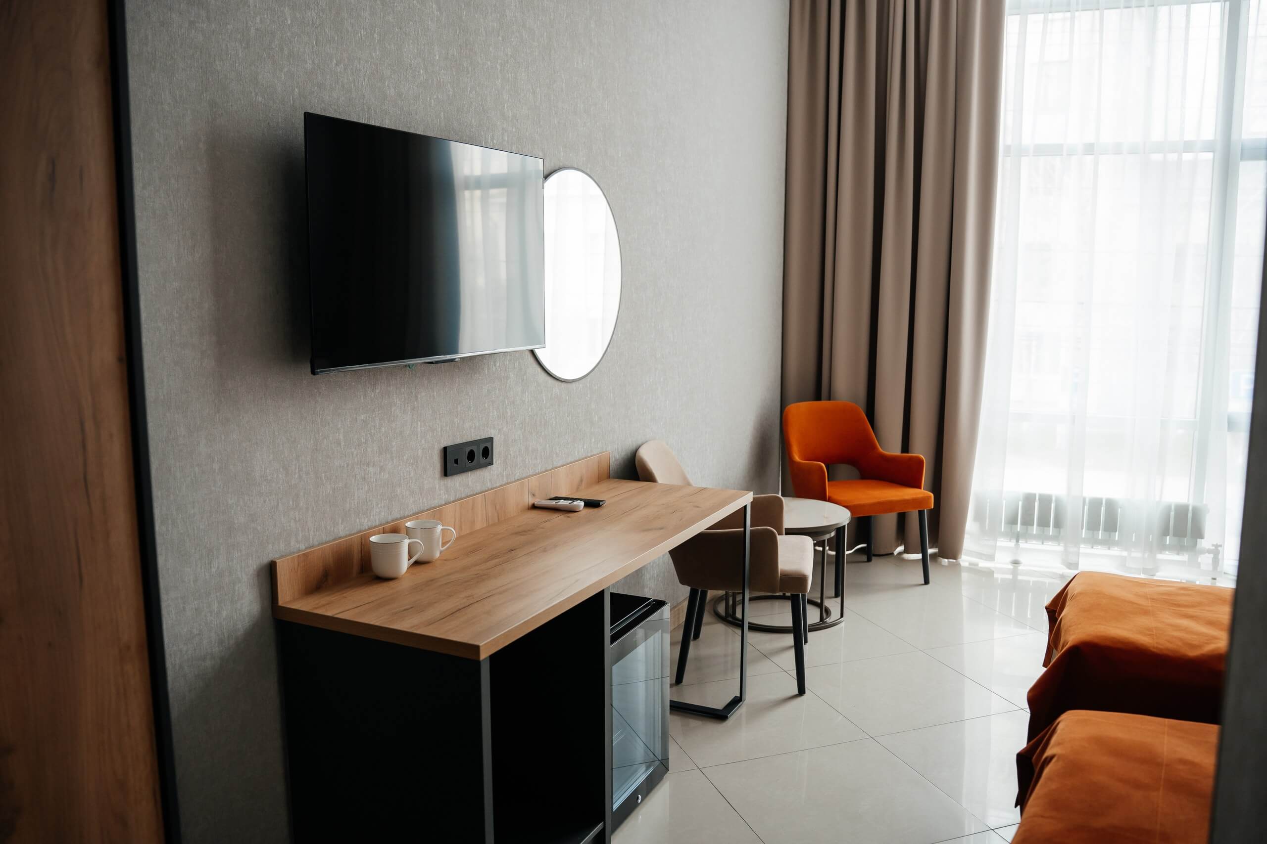 Две раздельные кровати с возможностью объединить, тумбочки со светильниками, кресло-кровать, телевизор, кондиционер, мини-бар, туалетный столик