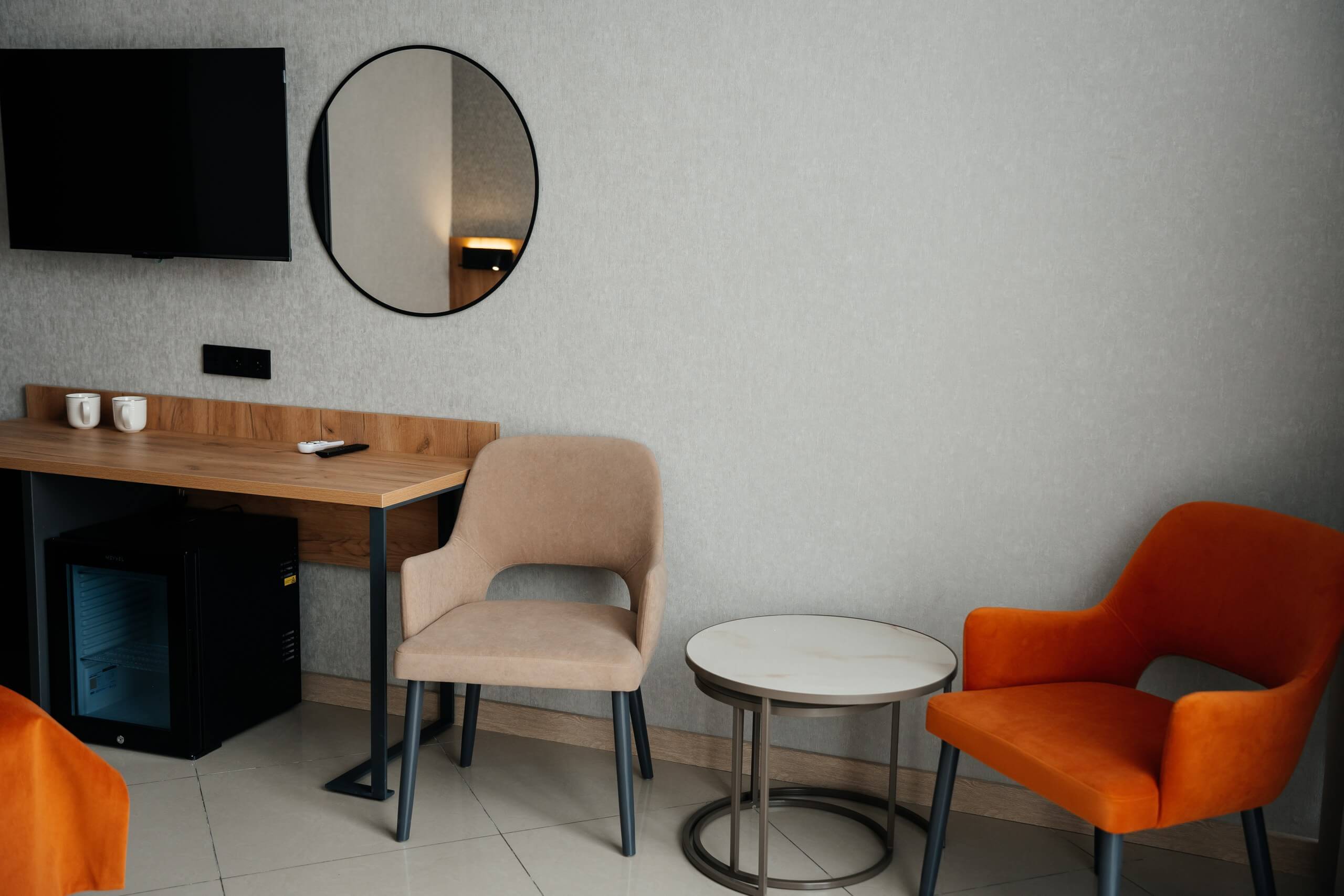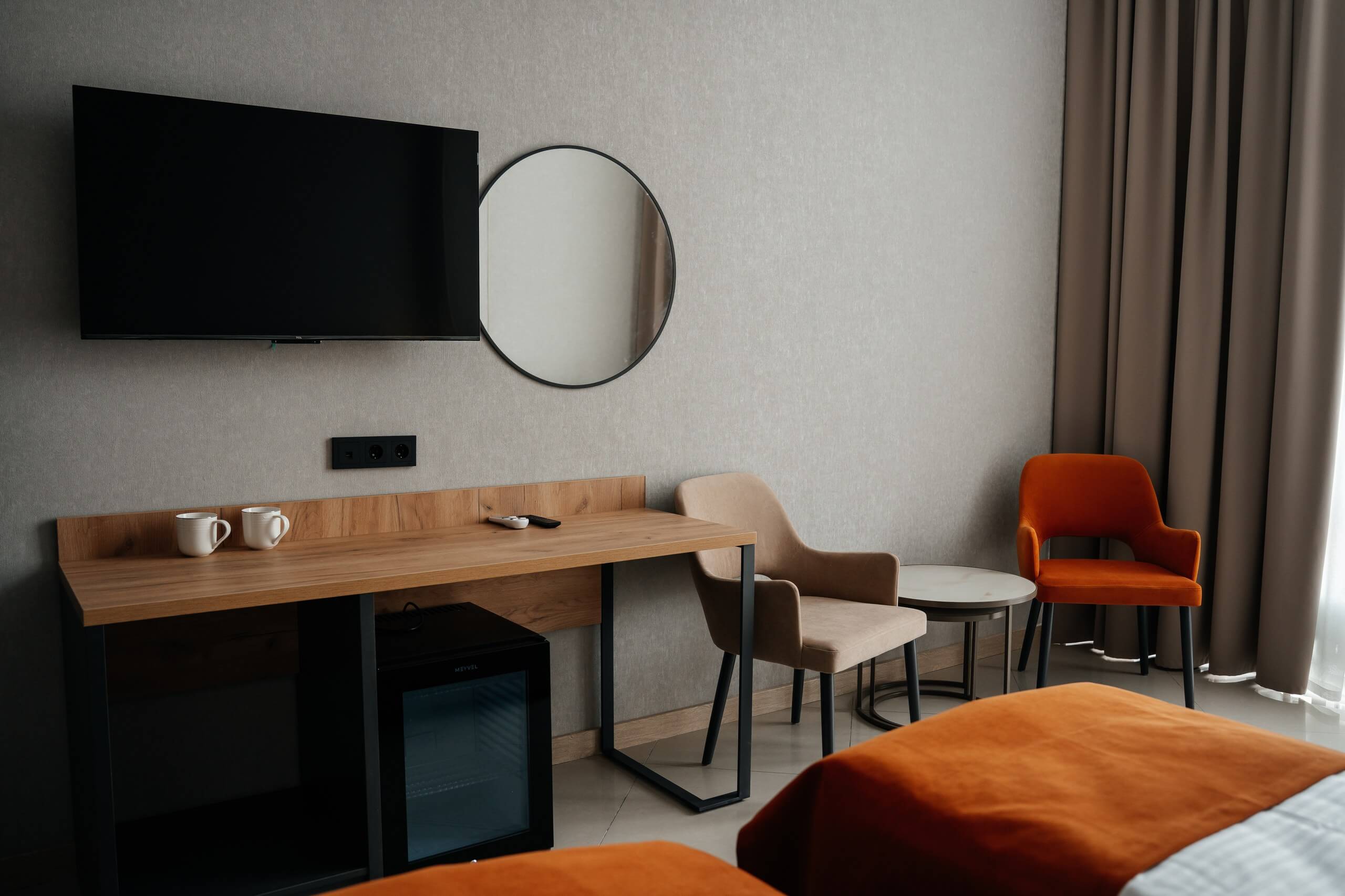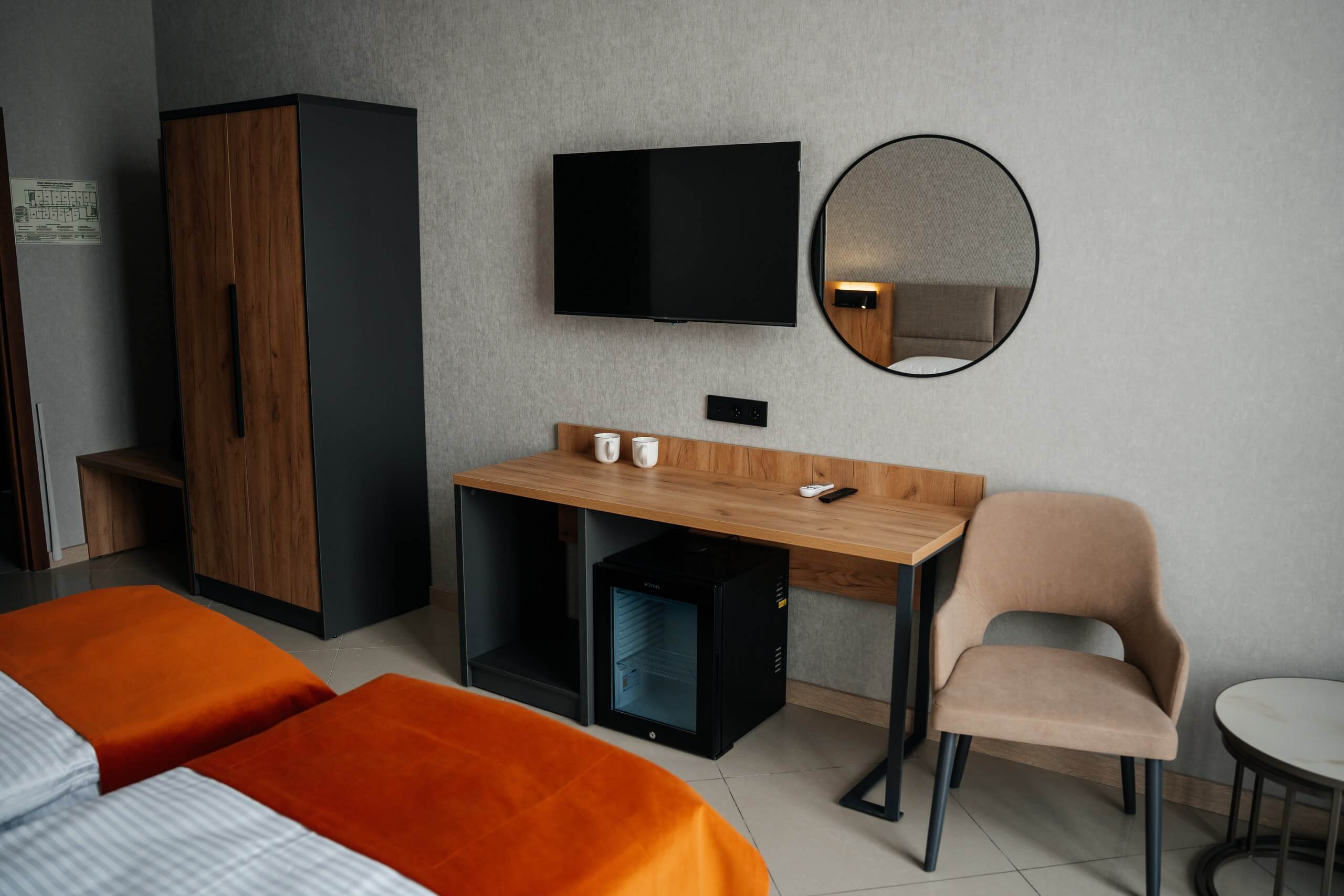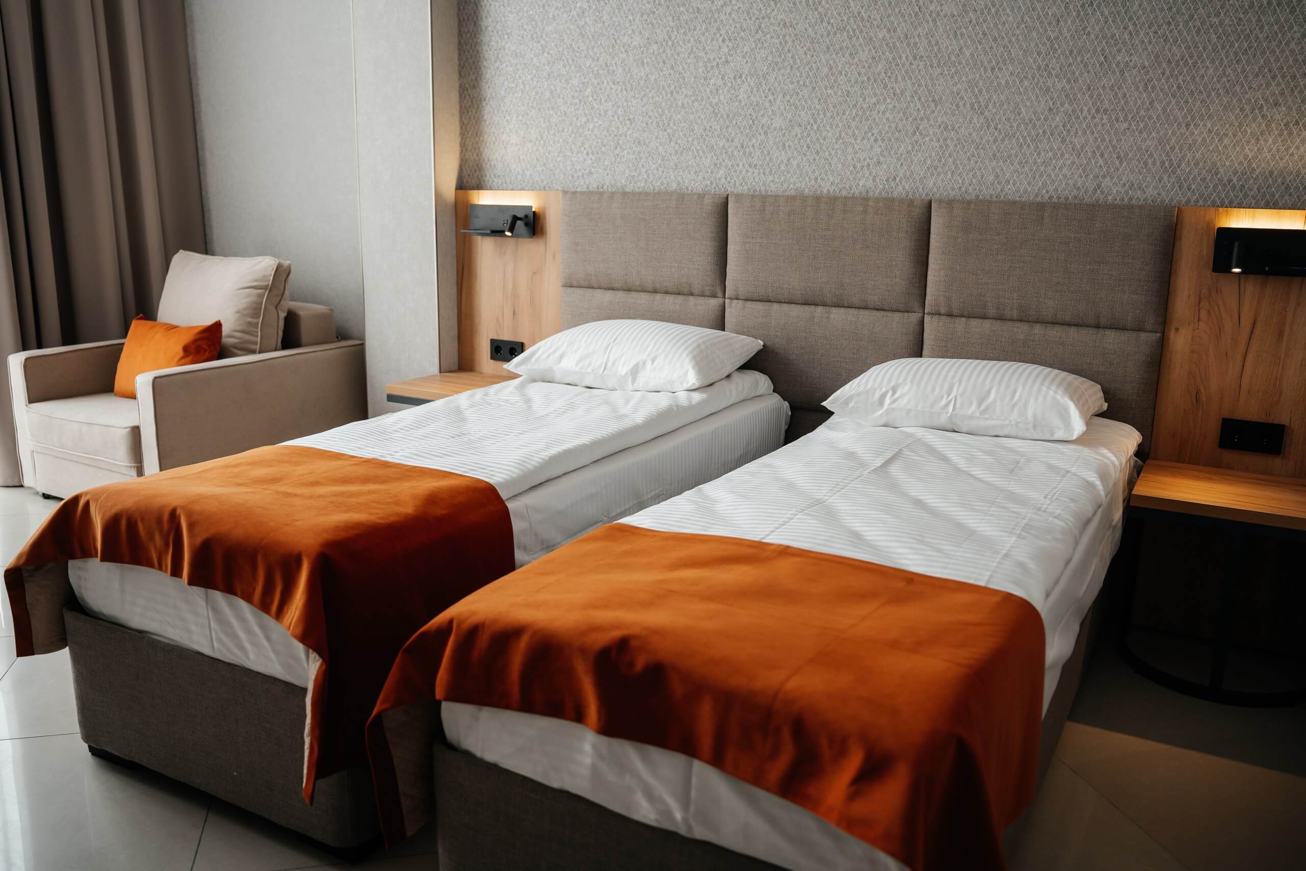 Две раздельные кровати с возможностью объединить, тумбочки со светильниками, кресло-кровать, телевизор, кондиционер, мини-бар, туалетный столик